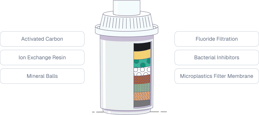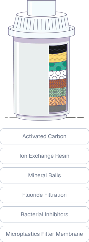 After extensive filtration, Klar will add minerals (Zinc, Selenium, trace potassium, magnesium) back into your filtered water giving you that signature taste.